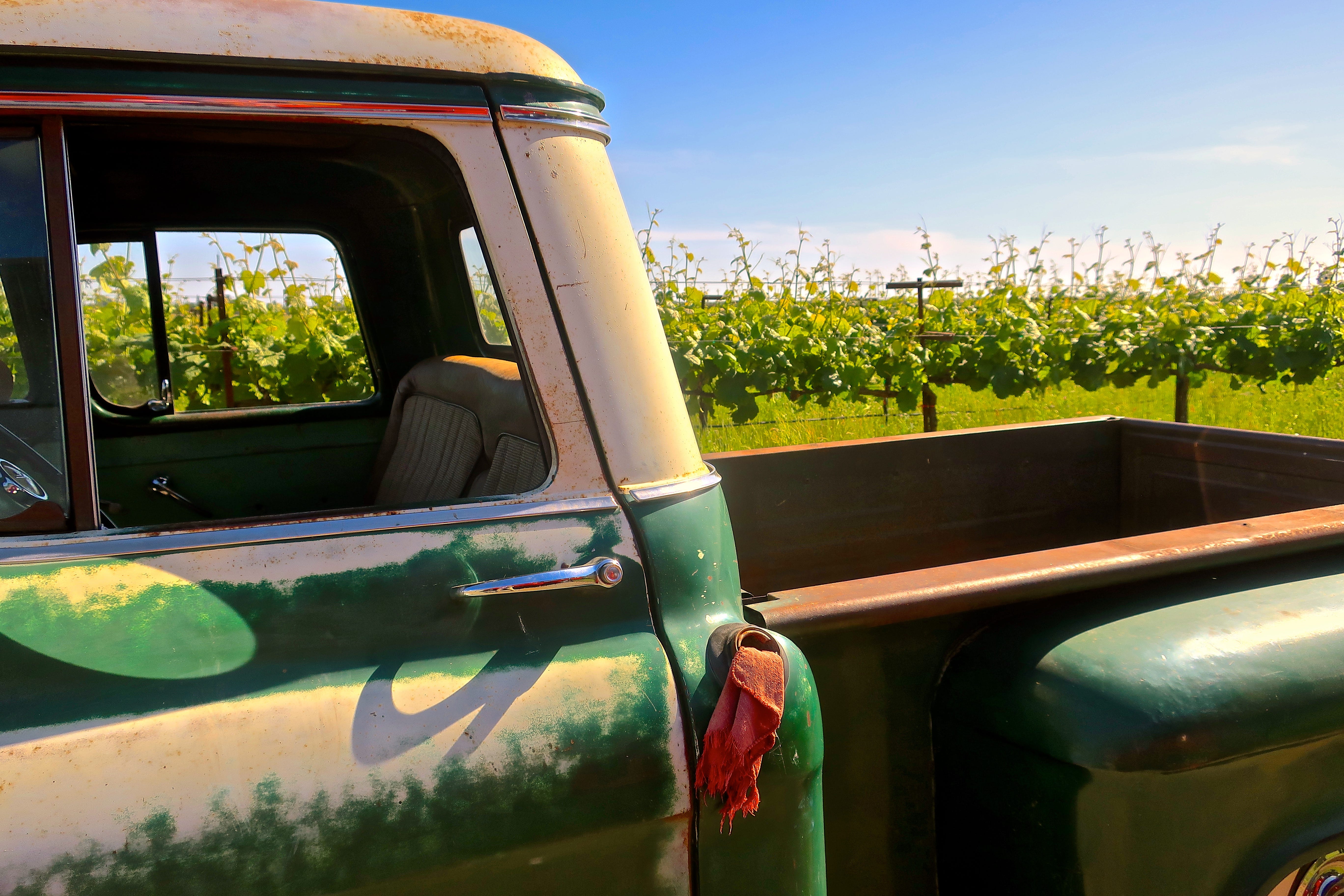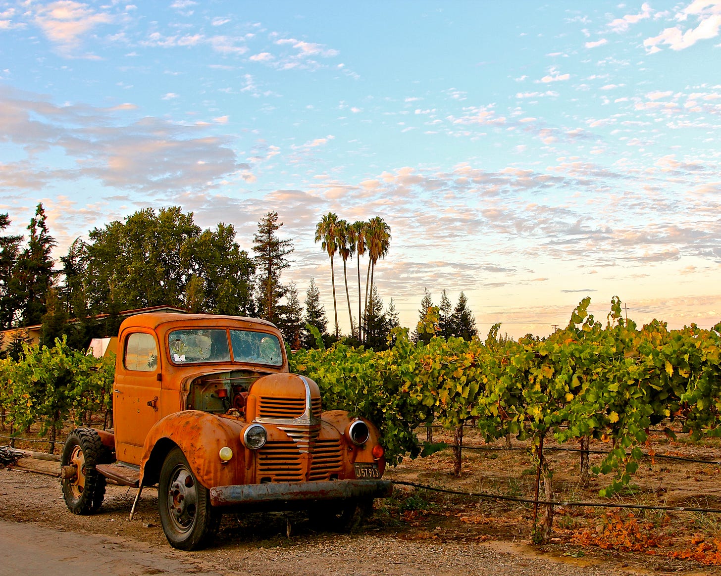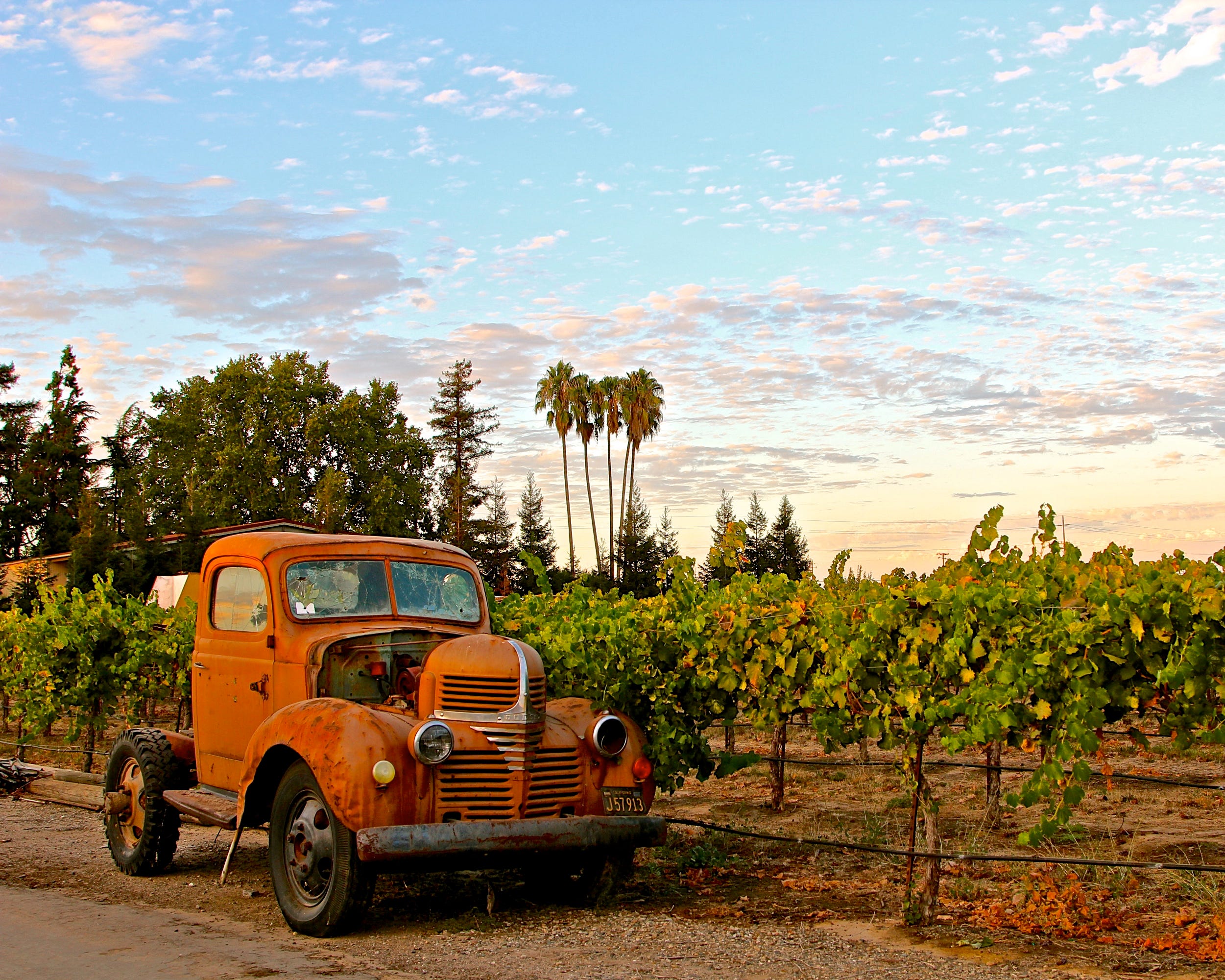 The old, decrepit truck had been parked at the edge of the vineyard for as long as anyone could remember. Who would drive such a bright orange truck? Old-timers remembered that it once belonged to Old Man Rios, a small, wizened, independent Filipino contractor who, for years, delivered crates of grapes to a packing shed shuttered long ago, just down the road. The local kids would weave banana bikes alongside it, waving as Rios puttered slowly by, his dog Max in the passenger seat, ears flapping in the wind through the open window.